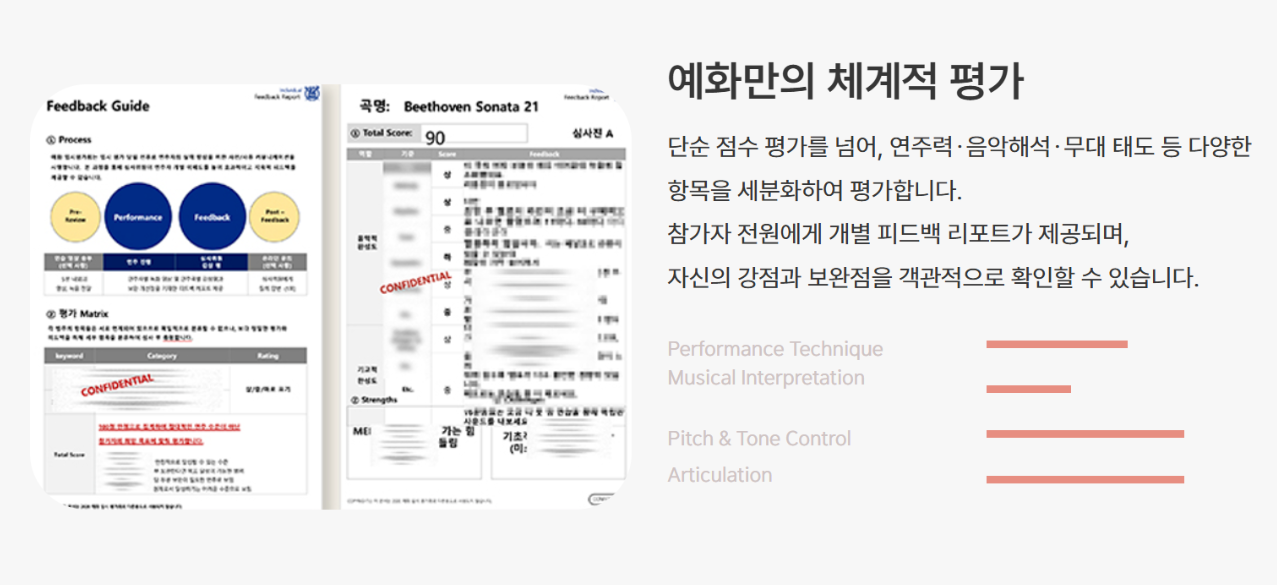 단일 점수가 아닌, 세분화된 항목별 평가 시스템을 운영합니다. 연주자의 음악적 해석력, 표현력, 무대 집중도 등 다양한 평가 기준을 기반으로 심사진이 리포트를 작성하여 제공합니다.