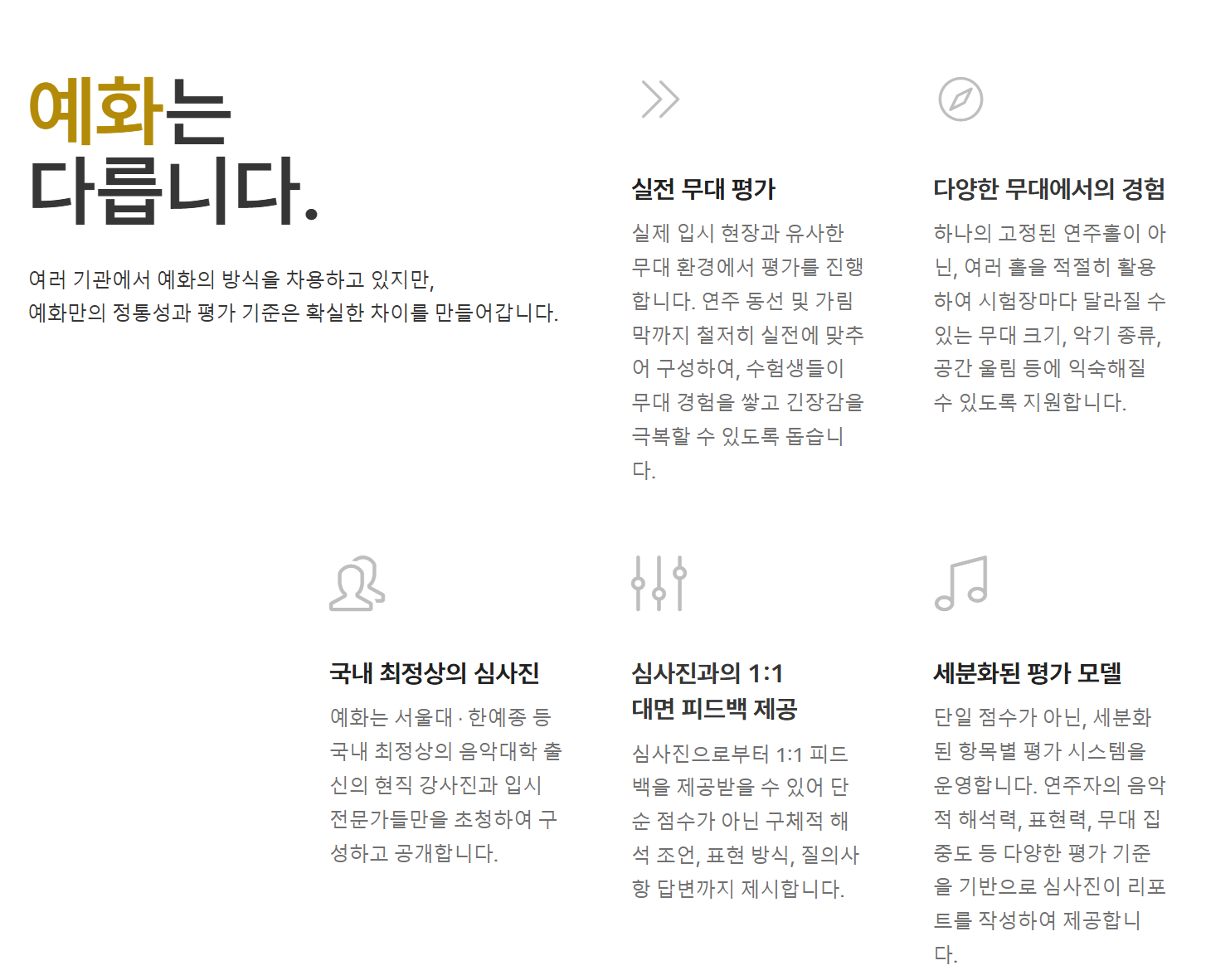 하나의 고정된 연주홀이 아닌, 여러 홀을 적절히 활용하여 시험장마다 달라질 수 있는 무대 크기, 악기 종류, 공간 울림 등에 익숙해질 수 있도록 지원합니다.
