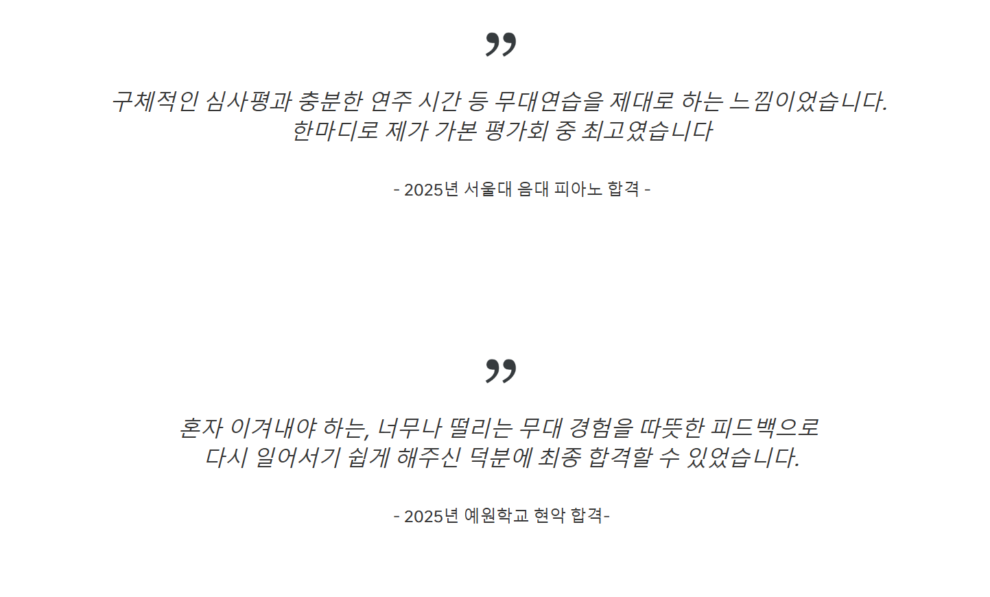 실제 입시 현장과 유사한 무대 환경에서 평가를 진행합니다. 연주 동선 및 가림막까지 철저히 실전에 맞추어 구성하여, 수험생들이 무대 경험을 쌓고 긴장감을 극복할 수 있도록 돕습니다.