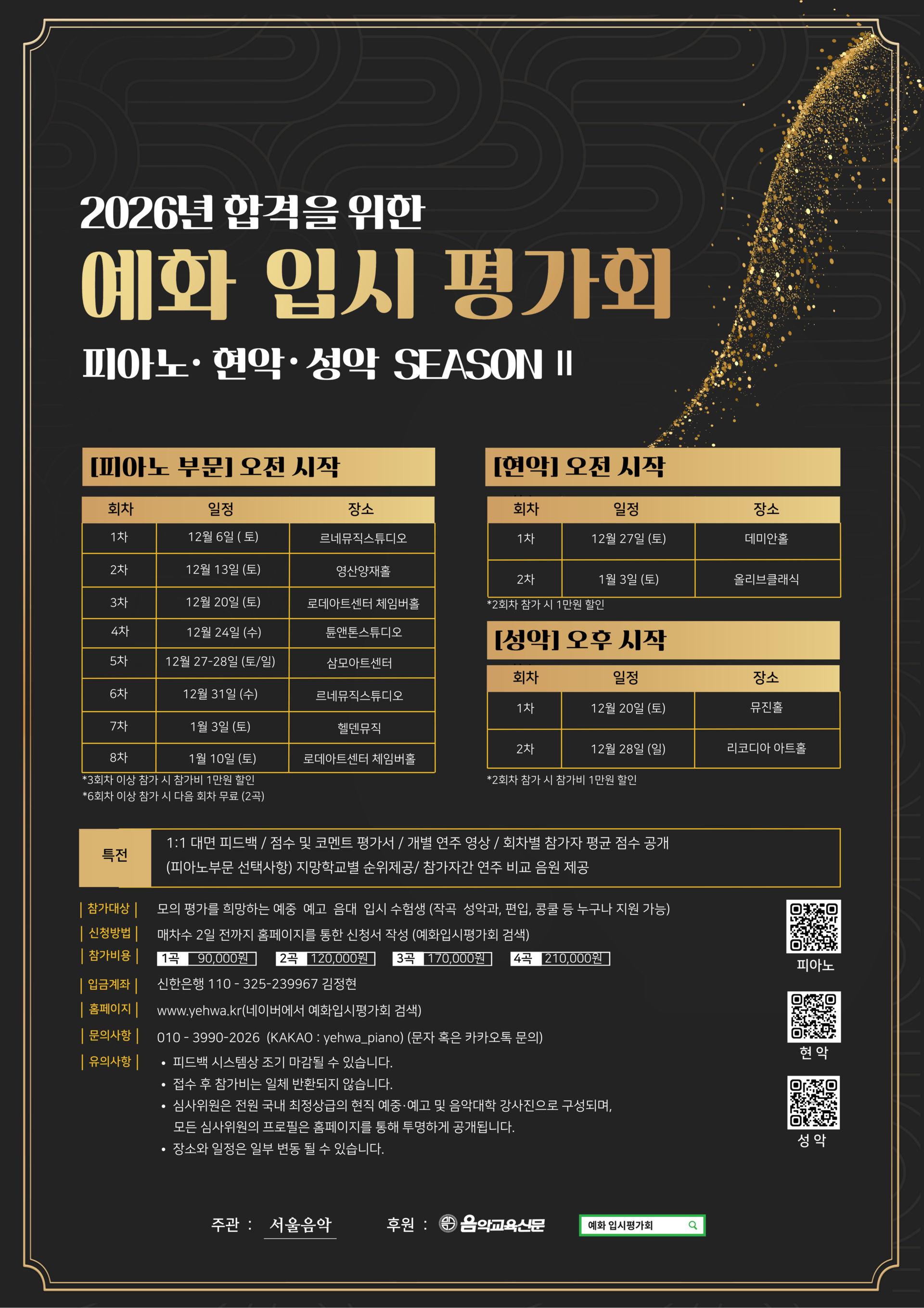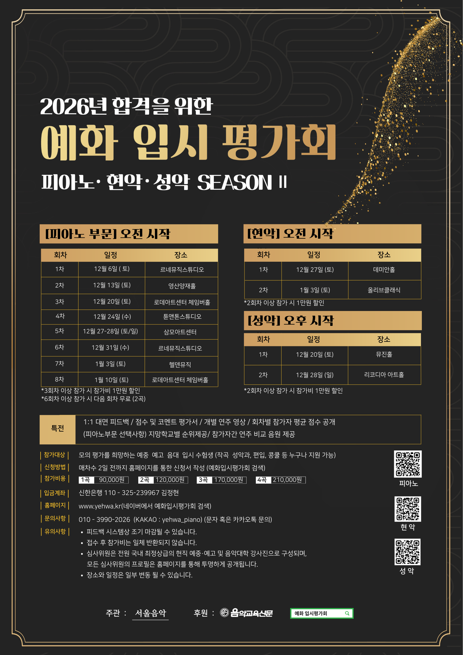 바이올린, 비올라, 첼로 등 모든 현악 전공자를 대상으로 평가가 진행됩니다.