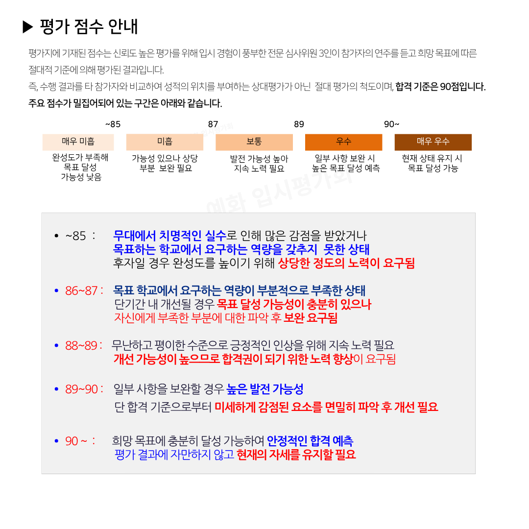 예화만의 차별화된 심사 시스템은 현직에서 후학을 양성 중인 유수 심사위원들과 연주자들을 인터뷰하여 도출한 결과물로, 입시생에게 가장 필요한 지원과 기회에 대해 철저히 분석한 결과 기획되었습니다.